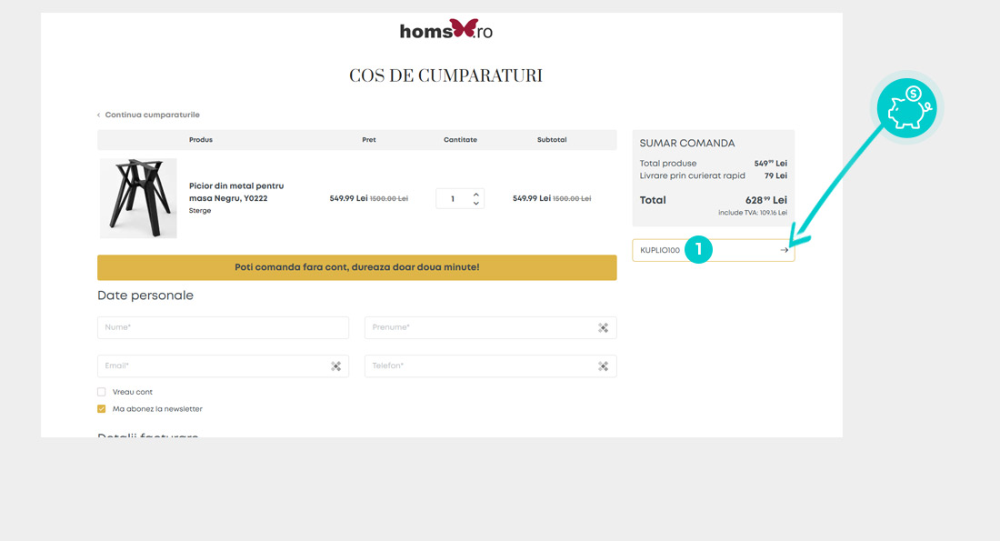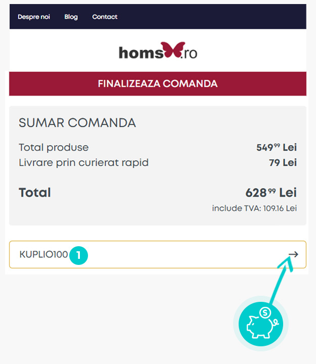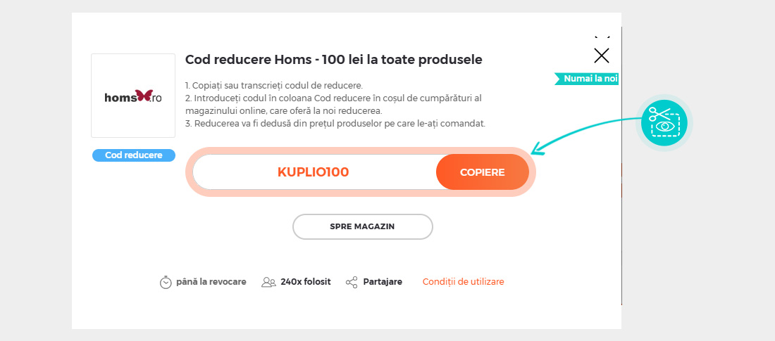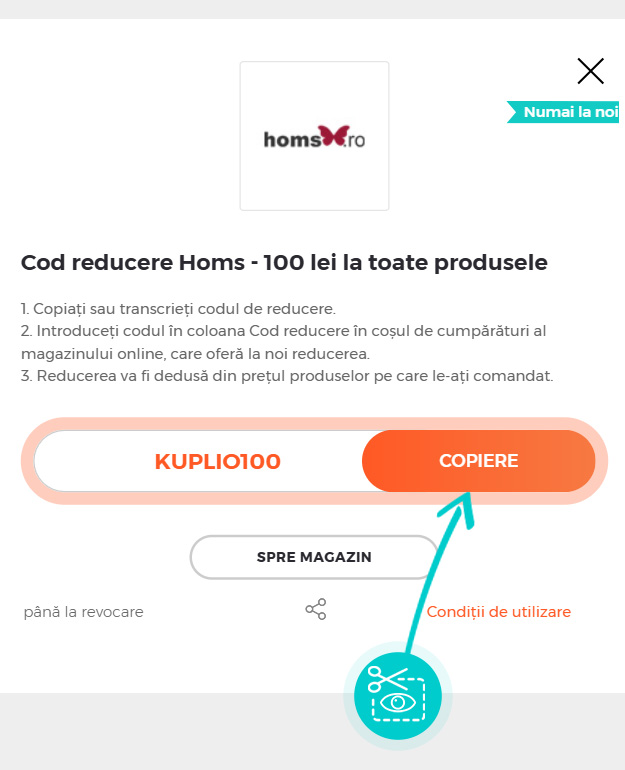 Copiați sau transcrieți cod reducere și faceți click pe butonul portocaliu „Transfer în magazin“, ulterior veți fi redirecționat direct în magazinul online Homs.ro.