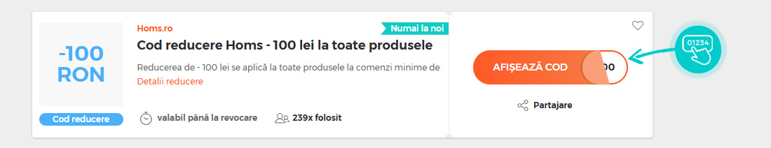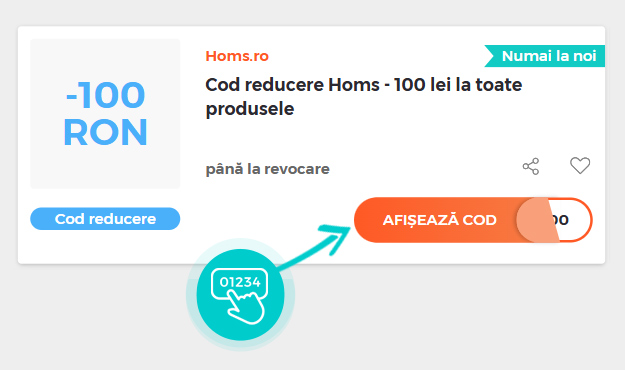 Selectați cod reducere concret de pe pagina noastră, pe care doriți să-l aplicați în magazinul online Homs.ro. Faceți click pe butonul portocaliu „Afișează codul”.