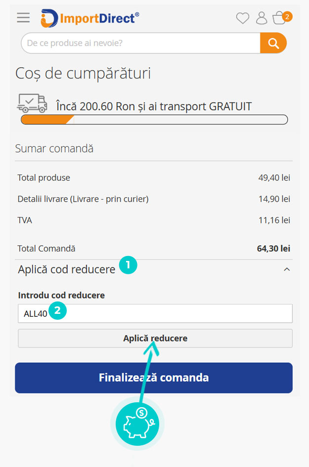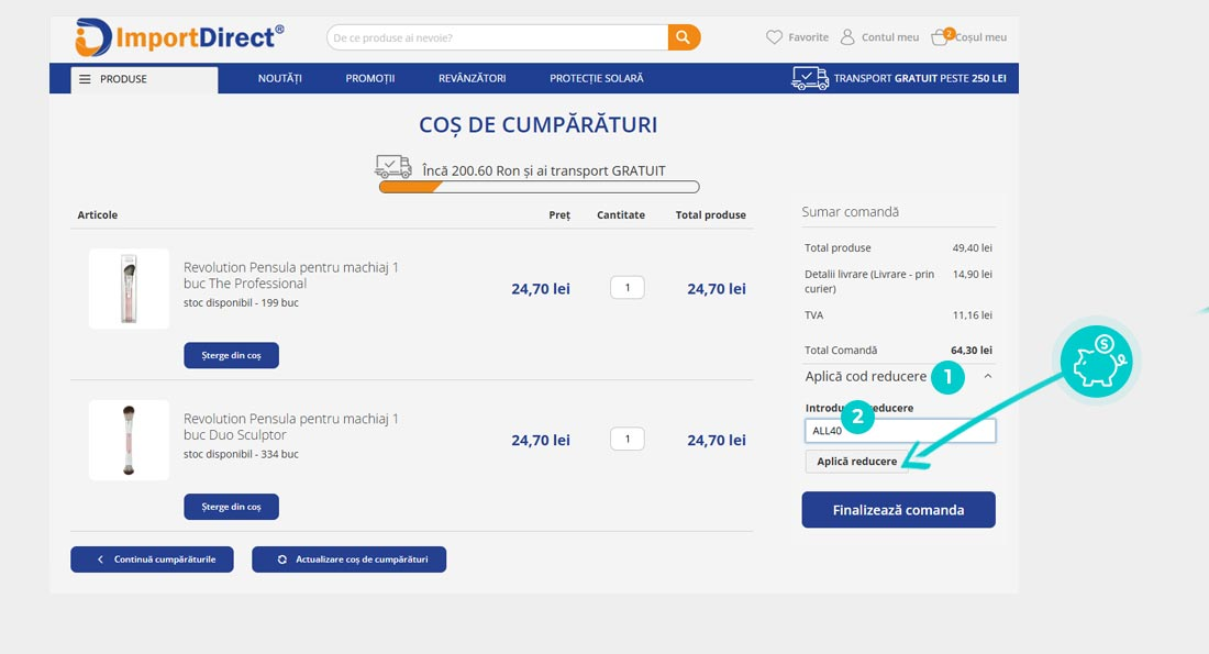 Alegeți produsul care vă interesează în magazinul online Importdirect.ro apăsați butonul „Adaugă la coș” și produsul se va introduce automat în coșul de cumpărături. În coșul de cumpărături sub produsul ales de dumneavoastră se află o rubrică „Am un cod promo“. Aici veți introduce codul de reducere copiat sau îl transcrieți manual și confirmați prin butonul “Folosește“.