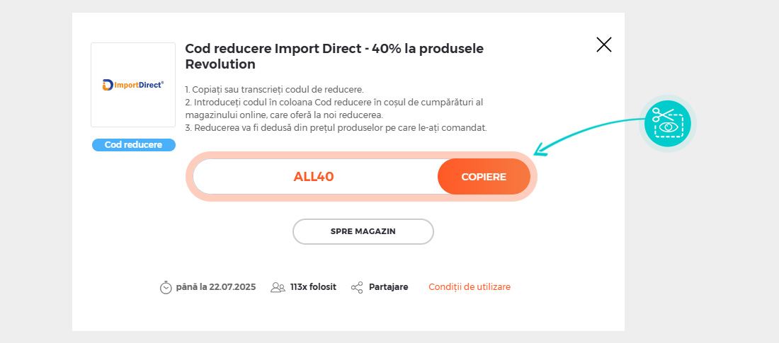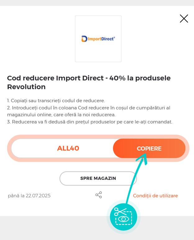 Copiați sau transcrieți codul de reducere și faceți click pe butonul portocaliu „Transfer în magazin“, ulterior veți fi redirecționat direct în magazinul online Importdirect.ro.