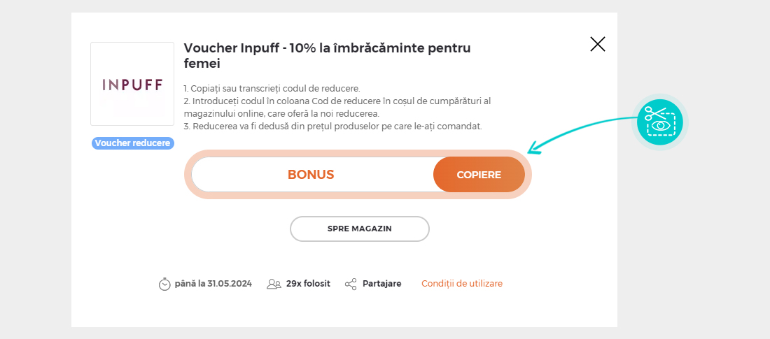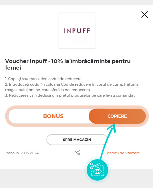 Copiați sau transcrieți cod reducere și faceți click pe butonul portocaliu „Transfer în magazin“, ulterior veți fi redirecționat direct în magazinul online Inpuff.ro.