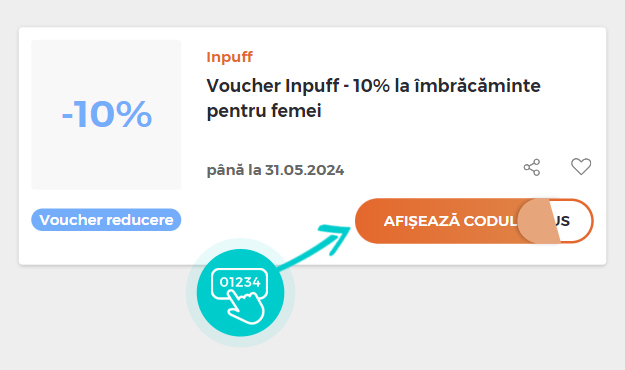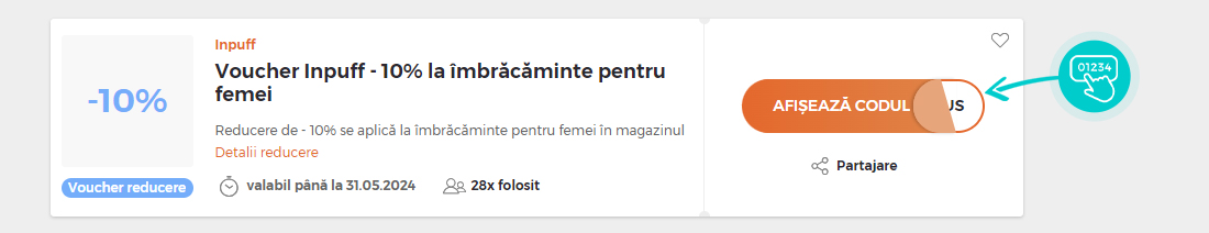 Selectați cod reducere concret de pe pagina noastră, pe care doriți să-l aplicați în magazinul online Inpuff.ro. Faceți click pe butonul portocaliu „Afișează codul”.