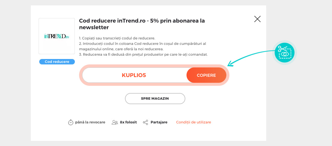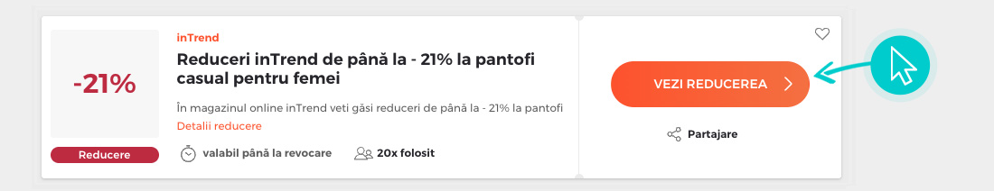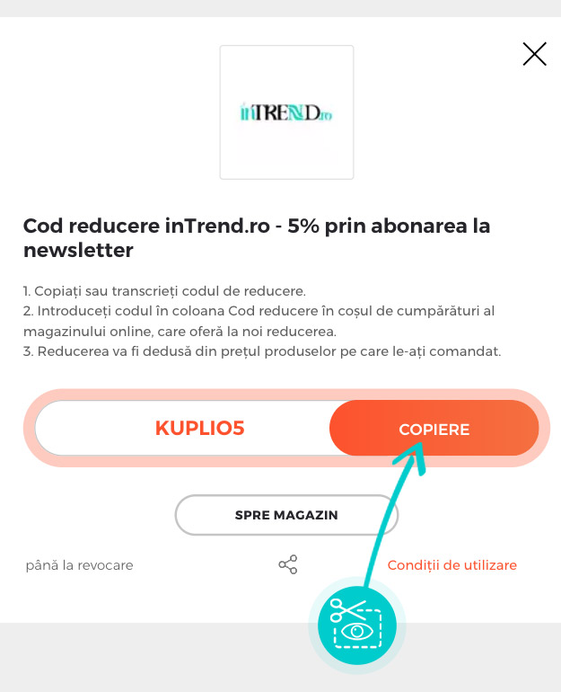 Copiați sau transcrieți cod reducere și faceți click pe butonul portocaliu „Transfer în magazin“, ulterior veți fi redirecționat direct în magazinul online inTrend.ro.