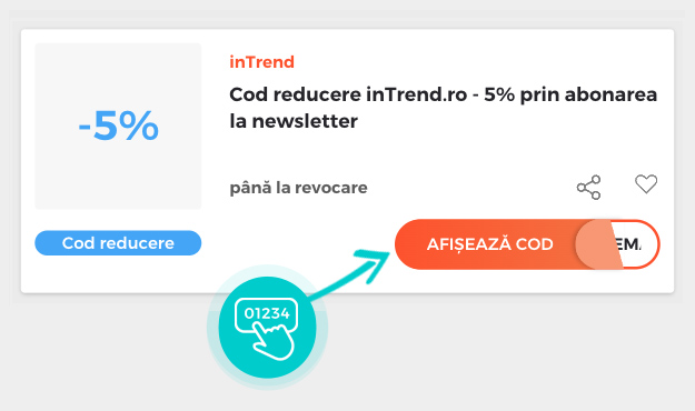 Reducerea de - 5% se aplică la prima comandă dacă vă abonați în magazinul online inTrend.ro atunci când introduceți codul de reducere în coșul de cumpărături. Aplicați cod reducere inTrend și puteți cumpăra încăltăminte mai ieftin.