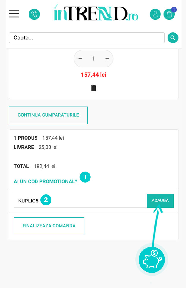 Alegeți produsul care vă interesează în magazinul online inTrend.ro apăsați butonul „Adaugă în coș” și produsul se va introduce în coșul de cumpărături. În coșul de cumpărături sub produsul ales de dumneavoastră se află o rubrică „Am voucher cadou sau un cod special“. Aici veți introduce codul de reducere copiat sau îl transcrieți manual și confirmați prin butonul “Folosește“.
