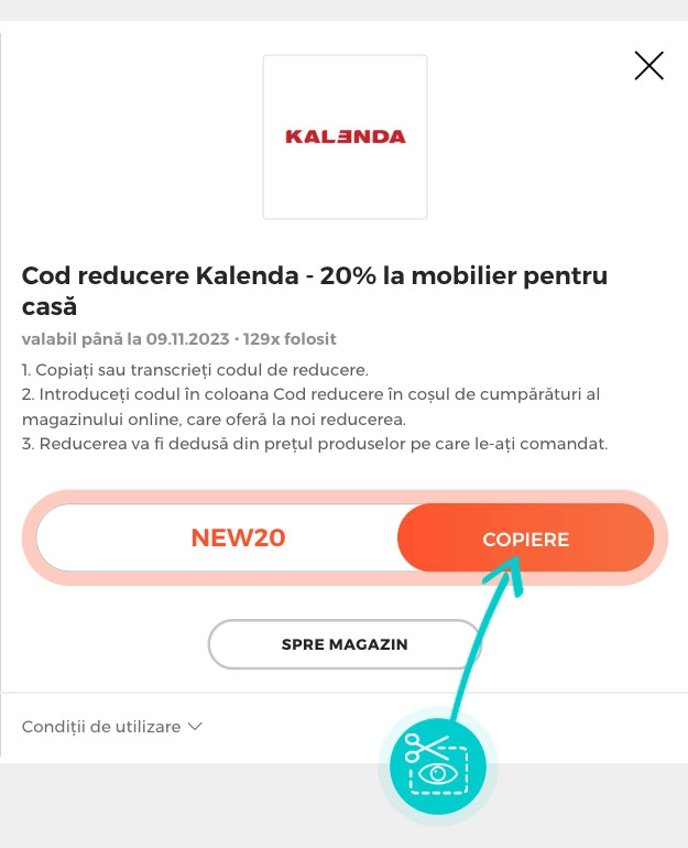 Selectați cod reducere concret de pe pagina noastră, pe care doriți să-l aplicați în magazinul online Kalenda.ro. Faceți click pe butonul portocaliu „Afișează codul”.