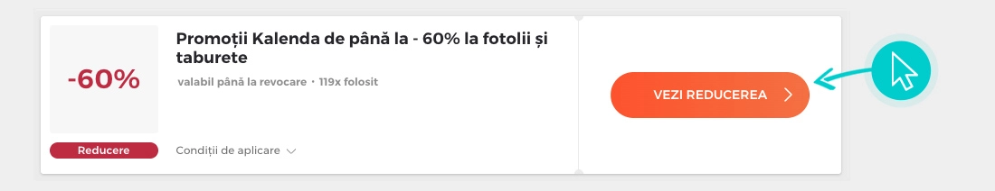 Valoarea reducerii: -20%Reducerea de - 20% se aplică la mobilier în magazinul online Kalenda atunci când introduceți codul de reducere în coșul de cumpărături. Aplicai voucher Kalenda și cumpărați mobilier și accesorii mai ieftin.