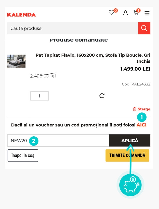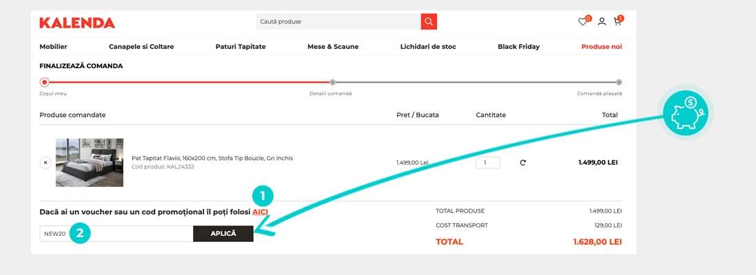 Alegeți produsul care vă interesează în magazinul online Kalenda.ro apăsați butonul „Adaugă în coș” și produsul se va introduce în coșul de cumpărături. În coșul de cumpărături sub produsul ales de dumneavoastră se află o rubrică „Adaugă un cod reducere“. Aici veți introduce codul de reducere copiat sau îl transcrieți manual și confirmați prin butonul “Aplică“.