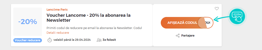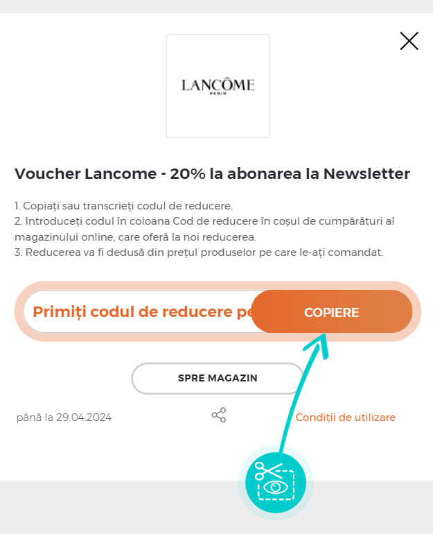 Selectați cod reducere concret de pe pagina noastră, pe care doriți să-l aplicați în magazinul online Lancome.ro Faceți click pe butonul portocaliu „Afișează codul”.