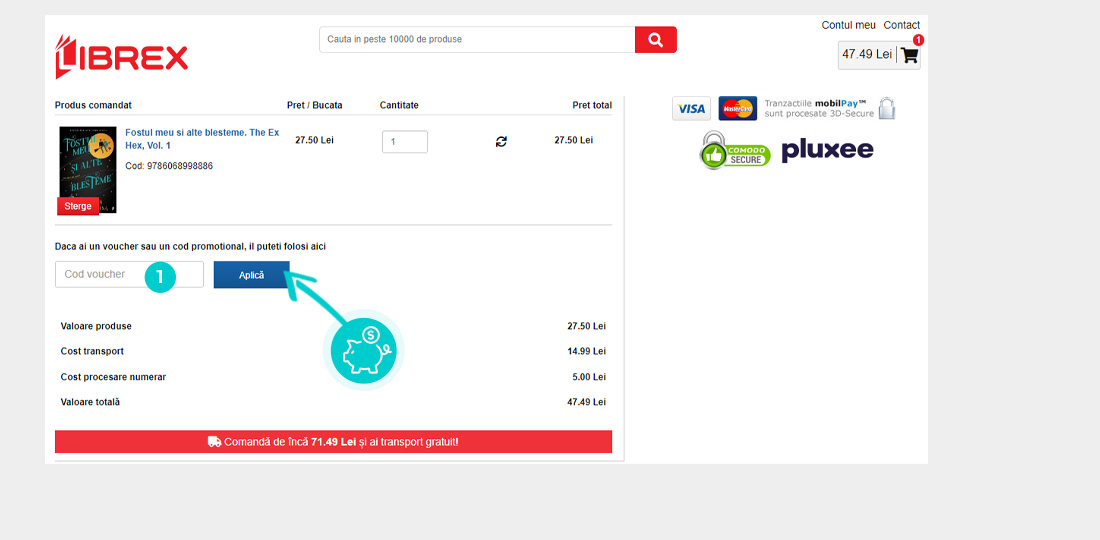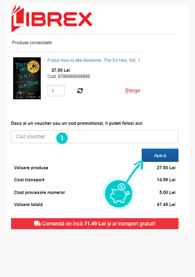 Alegeți produsul care vă interesează în magazinul online Librex.ro apăsați butonul „Adaugă în coș” și produsul se va introduce în coșul de cumpărături. În coșul de cumpărături sub produsul ales de dumneavoastră se află o rubrică „Introdu mai jos Codul!“. Aici veți introduce codul de reducere copiat sau îl transcrieți manual și confirmați prin butonul “Confirmă“.