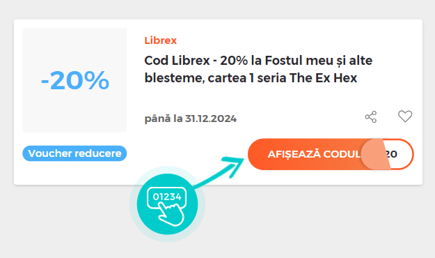 Selectați codul reducere concret de pe pagina noastră, pe care doriți să-l aplicați în magazinul online Librex.ro. Faceți click pe butonul portocaliu „Afișează codul”.