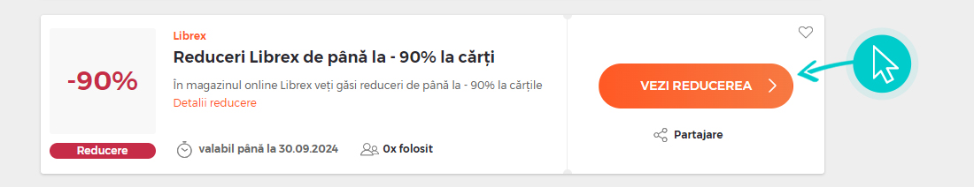 Alegeți o reducere Librex concretă de pe pagina noastră faceți click pe „Vezi reducerea“ și veți fi redirecționați în mod automat în magazinul online Librex.ro direct la oferta promoțională, de unde puteți cumpăra produsul dorit la reducere.