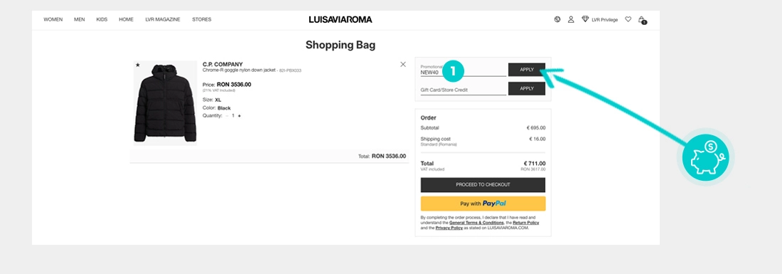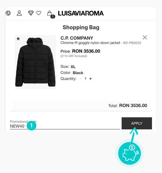 Alegeți produsul care vă interesează în magazinul online Luisaviaroma.com apăsați butonul „Adaugă la coș” și produsul se va introduce automat în coșul de cumpărături. În coșul de cumpărături sub produsul ales de dumneavoastră se află o rubrică „Am un cod promo“. Aici veți introduce cod reducere copiat sau îl transcrieți manual și confirmați prin butonul “Folosește“.