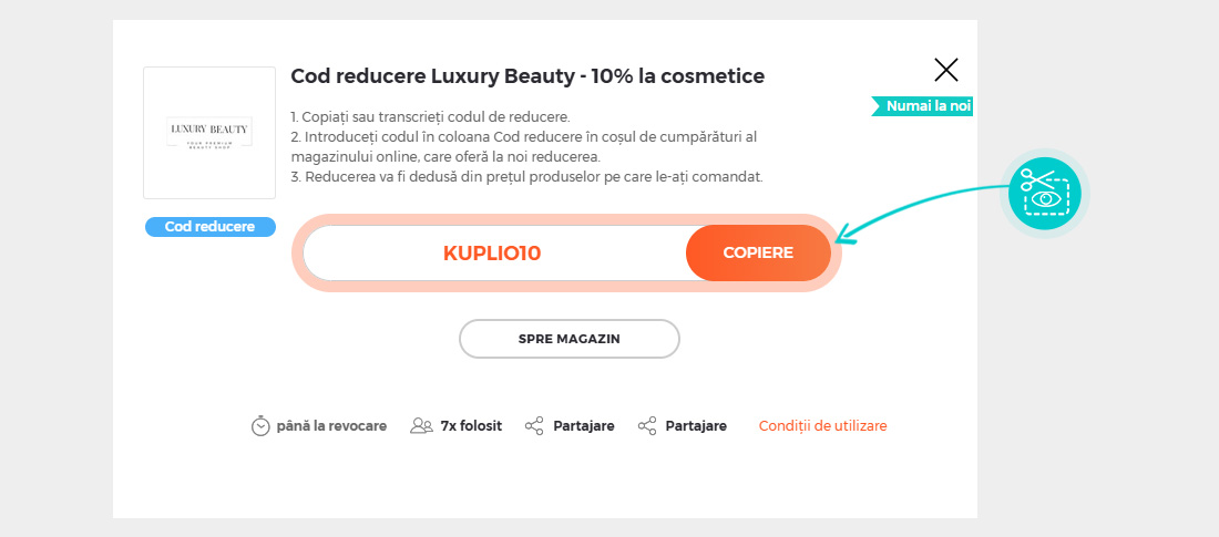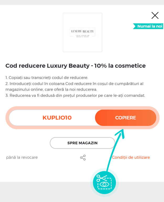 Copiați sau transcrieți cod reducere și faceți click pe butonul portocaliu „Transfer în magazin“, ulterior veți fi redirecționat direct în magazinul online Luxury Beauty.ro.