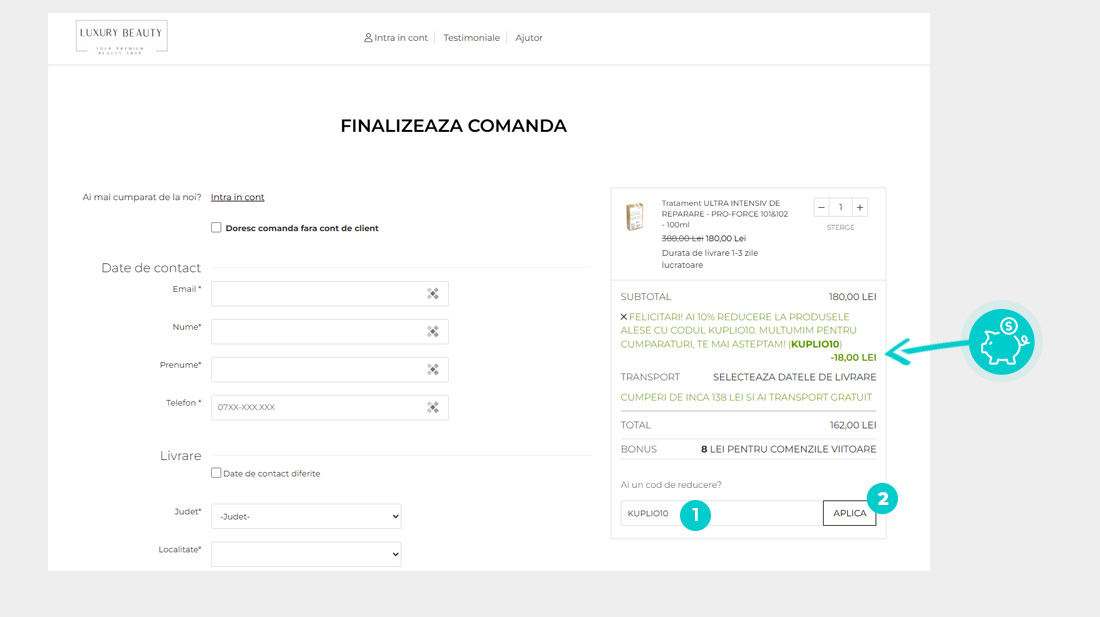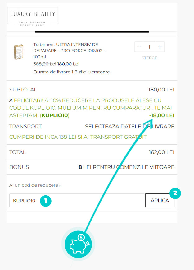 Alegeți produsul care vă interesează în magazinul online Luxury Beauty.ro apăsați butonul „Adaugă la coș” și produsul se va introduce automat în coșul de cumpărături. În coșul de cumpărături sub produsul ales de dumneavoastră se află o rubrică „Am un cod promo“. Aici veți introduce cod reducere copiat sau îl transcrieți manual și confirmați prin butonul “Folosește“.