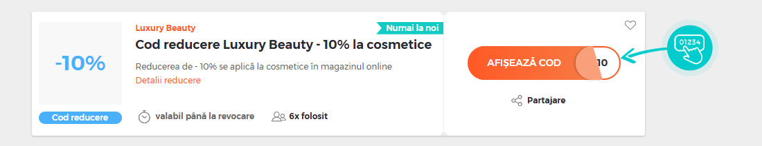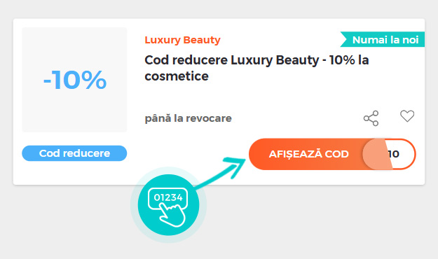Selectați cod reducere concret de pe pagina noastră, pe care doriți să-l aplicați în magazinul online Luxury Beauty .ro. Faceți click pe butonul portocaliu „Afișează codul”.
