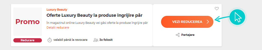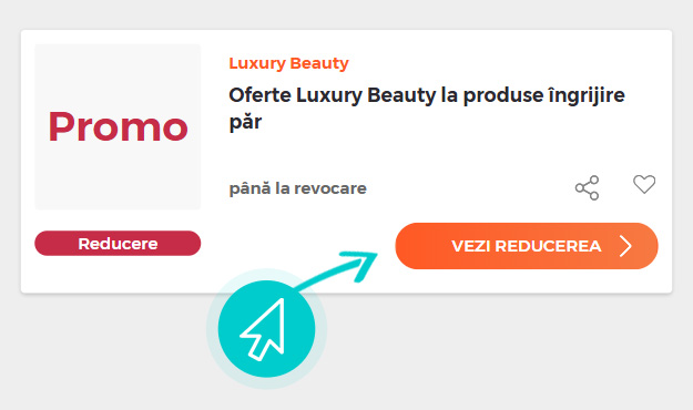 Alegeți o reducere Luxury Beauty concretă de pe pagina noastră faceți click pe „Vezi reducerea“ și veți fi redirecționați în mod automat în magazinul online Luxury Beauty.ro direct la oferta promoțională, de unde puteți cumpăra produsul dorit la reducere.