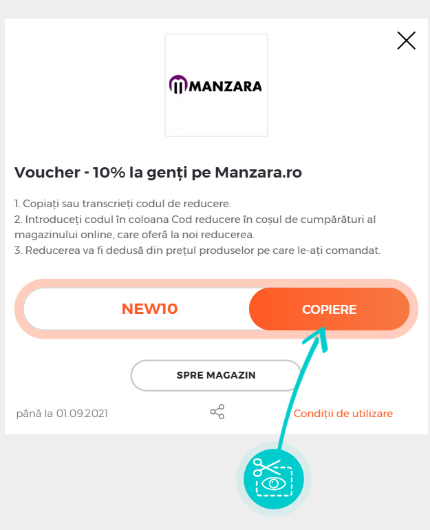 Copiați sau transcrieți cod reducere și faceți click pe butonul portocaliu „Transfer în magazin“, ulterior veți fi redirecționat direct în magazinul online Manzara.ro