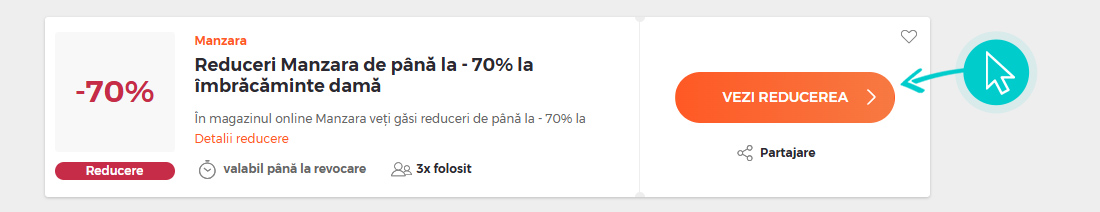 Selectați cod reducere concret de pe pagina noastră, pe care doriți să-l aplicați în magazinul online Manzara.ro. Faceți click pe butonul portocaliu „Afișează codul”.