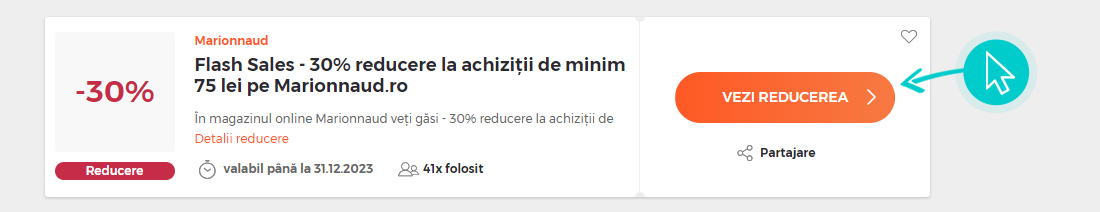 Alegeți o reducere Marionnaud concretă de pe pagina noastră faceți click pe „Vezi reducerea“ și veți fi redirecționați în mod automat în magazinul online mariiodirect la oferta promoțională, de unde puteți cumpăra produsul dorit la reducere.