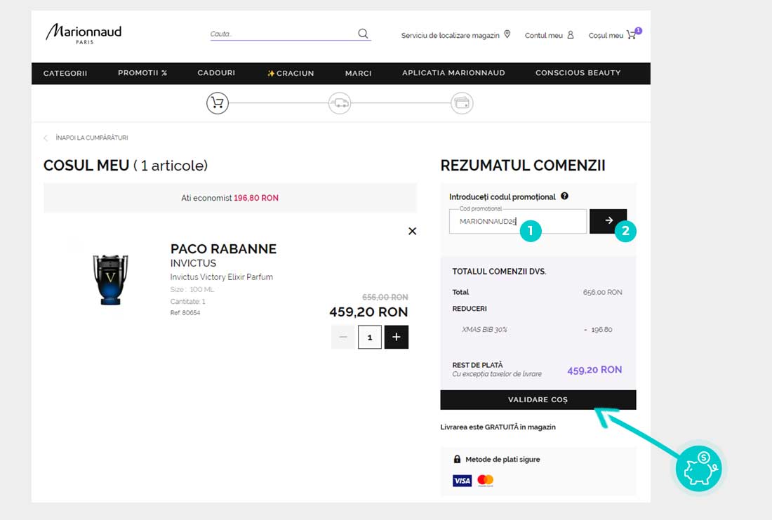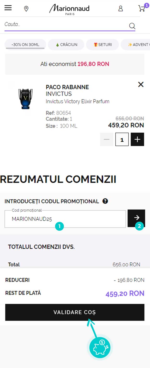 Alegeți produsul care vă interesează în magazinul online Marionnaud.ro apăsați butonul „Adaugă în coș” și produsul se va introduce automat în coșul de cumpărături. În coșul de cumpărături sub produsul ales de dumneavoastră se află o rubrică „Cod voucher“. Aici veți introduce codul de reducere copiat sau îl transcrieți manual și confirmați prin butonul “Aplică voucher“.