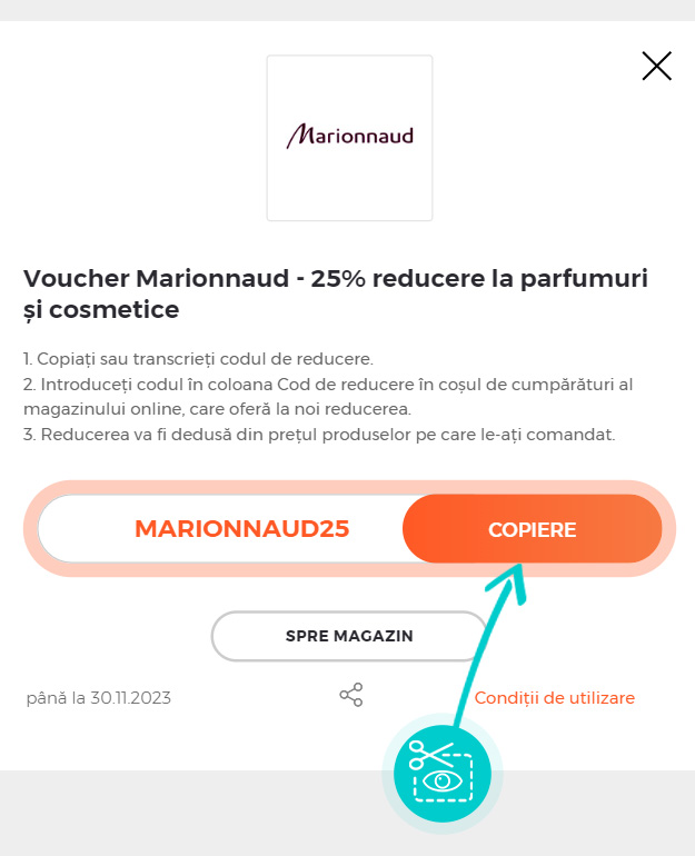 Copiați sau transcrieți cod reducere și faceți click pe butonul portocaliu „Transfer în magazin“, ulterior veți fi redirecționat direct în magazinul online Marionnaud.ro.