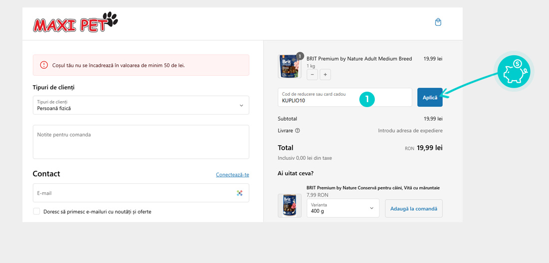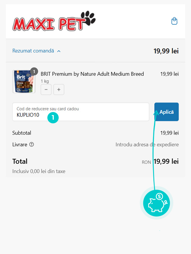 Alegeți produsul care vă interesează în magazinul online Maxipet.ro apăsați butonul „Adaugă în coș” și produsul se va introduce automat în coșul de cumpărături. În coșul de cumpărături sub produsul ales de dumneavoastră se află o rubrică „Cod de reducere sau card cadou“. Aici veți introduce cod reducere copiat sau îl transcrieți manual și confirmați prin butonul “Aplică“.