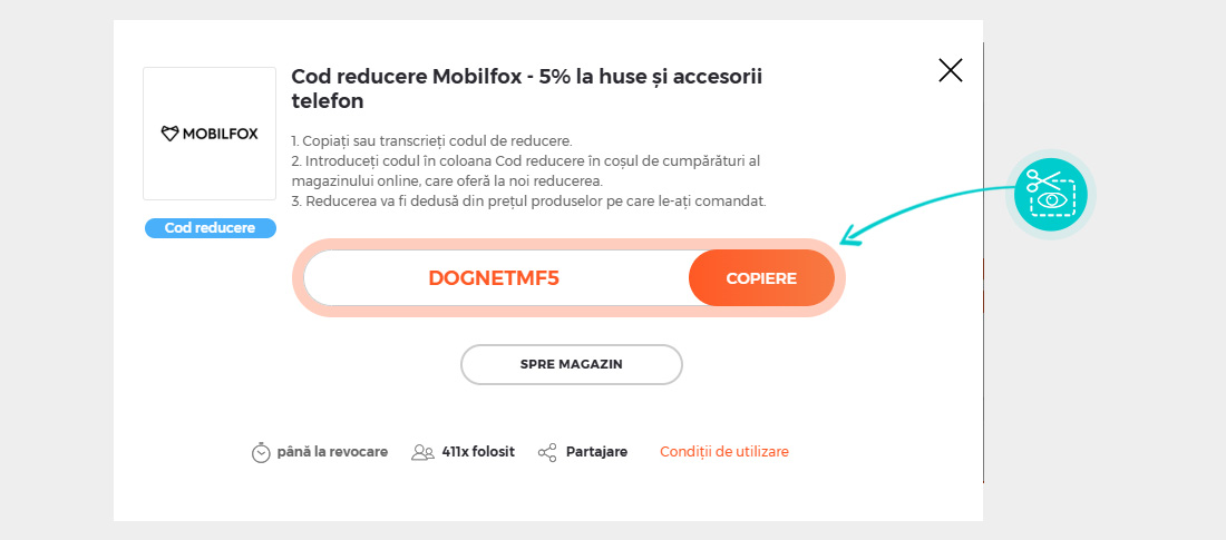 Copiați sau transcrieți cod reducere și faceți click pe butonul portocaliu „Transfer în magazin“, ulterior veți fi redirecționat direct în magazinul online Mobilfox.ro.