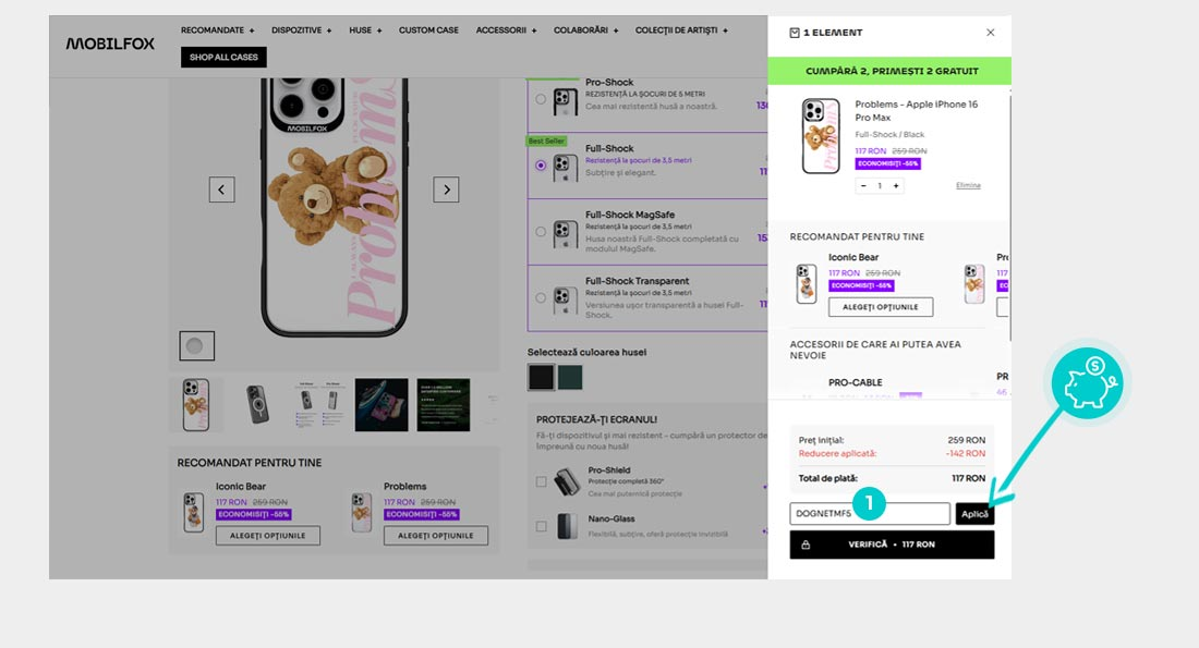 Alegeți produsul care vă interesează în magazinul online Mobilfox.ro apăsați butonul „Adaugă la coș” și produsul se va introduce automat în coșul de cumpărături. În coșul de cumpărături sub produsul ales de dumneavoastră se află o rubrică „Am un cod promo“. Aici veți introduce cod reducere copiat sau îl transcrieți manual și confirmați prin butonul “Folosește“.