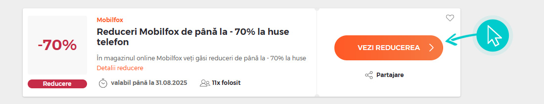 Alegeți o reducere MobilFox concretă de pe pagina noastră faceți click pe „Vezi reducerea“ și veți fi redirecționați în mod automat în magazinul online Mobilfox.ro direct la oferta promoțională, de unde puteți cumpăra produsul dorit la reducere.