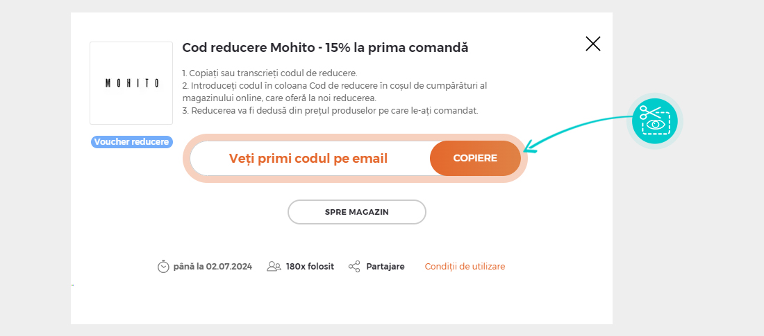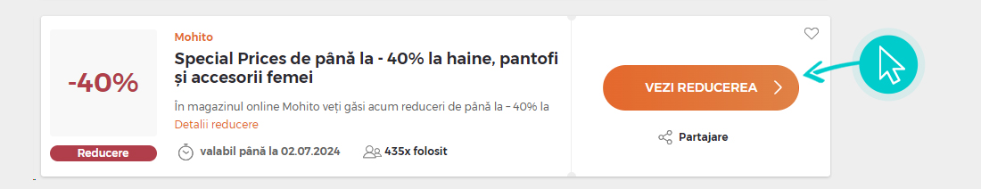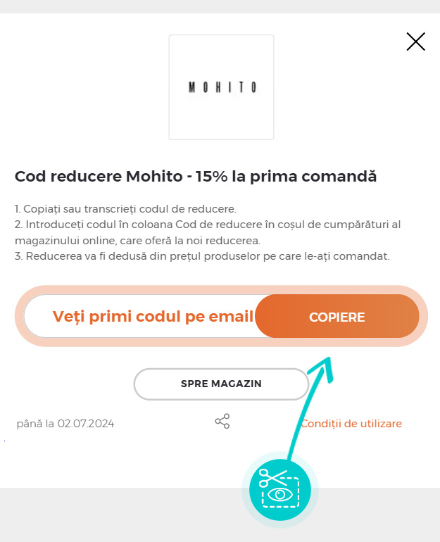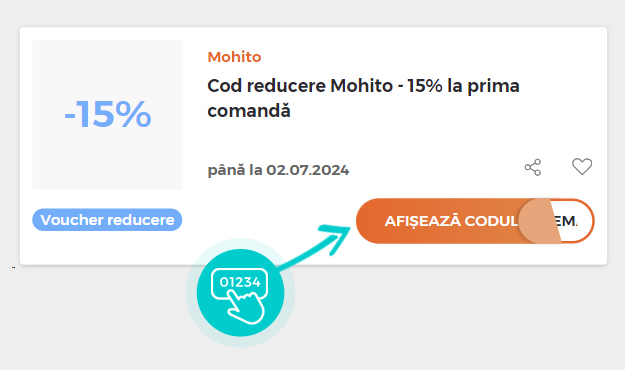 Selectați cod reducere concret de pe pagina noastră, pe care doriți să-l aplicați în magazinul online Mohito.ro. Faceți click pe butonul portocaliu „Afișează codul”.