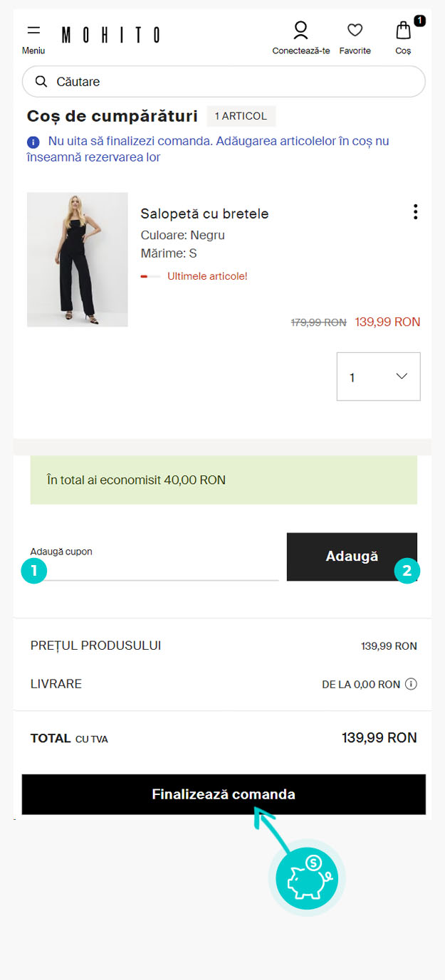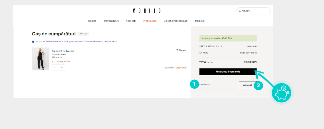 Alegeți produsul care vă interesează în magazinul online Mohito apăsați butonul „Adaugă în coș” și produsul se va introduce în coșul de cumpărături. În coșul de cumpărături sub produsul ales de dumneavoastră se află o rubrică „Introdu mai jos Codul!“.Aici veți introduce codul de reducere copiat sau îl transcrieți manual și confirmați prin butonul “Confirmă“.