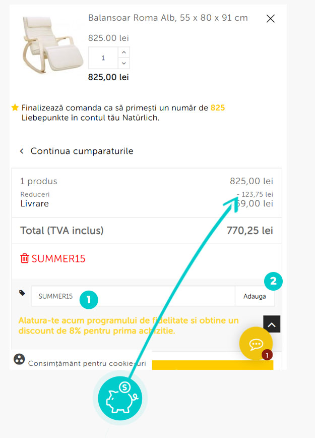 Alegeți produsul care vă interesează în magazinul online Naturlich.ro apăsați butonul „Adaugă în coș” și produsul se va introduce în coșul de cumpărături. În coșul de cumpărături sub produsul ales de dumneavoastră se află o rubrică „Am voucher cadou sau un cod special“. Aici veți introduce codul de reducere copiat sau îl transcrieți manual și confirmați prin butonul “Folosește“.