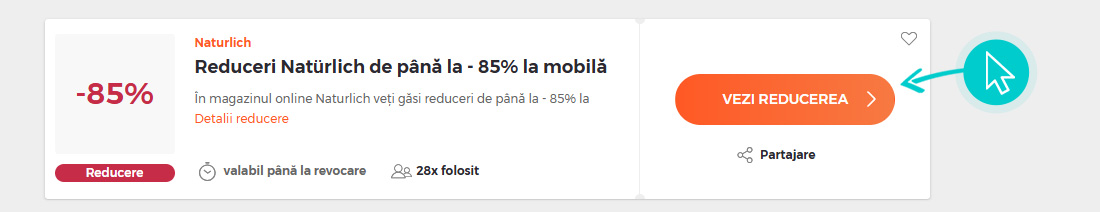Selectați cod reducere concret de pe pagina noastră, pe care doriți să-l aplicați în magazinul online Naturlich.ro. Faceți click pe butonul portocaliu „Afișează codul”.
