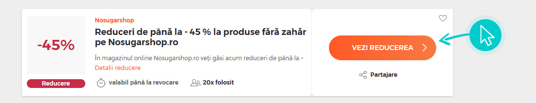Selectați cod reducere concret de pe pagina noastră, pe care doriți să-l aplicați în magazinul online Nosugarshop.ro. Faceți click pe butonul portocaliu „Afișează codul”.