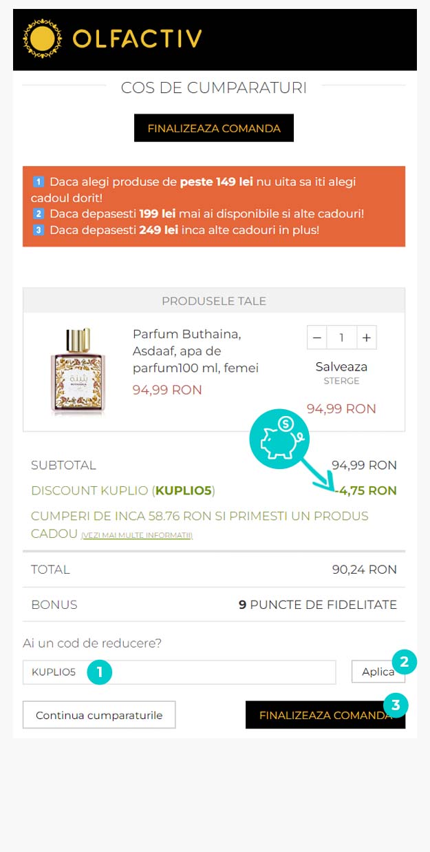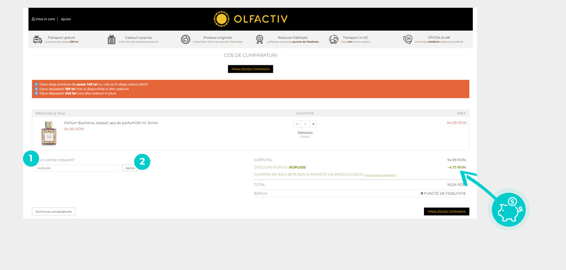 Alegeți produsul care vă interesează în magazinul online Olfactiv.ro apăsați butonul „Adaugă în coș” și produsul se va introduce automat în coșul de cumpărături. În coșul de cumpărături sub produsul ales de dumneavoastră se află o rubrică „Cod voucher“. Aici veți introduce cod reducere copiat sau îl transcrieți manual și confirmați prin butonul “Aplică voucher“.