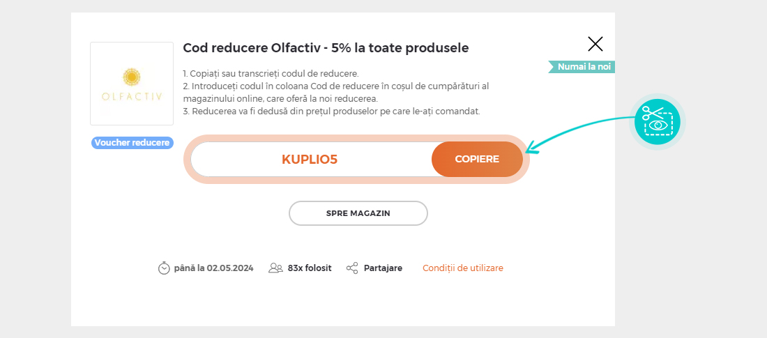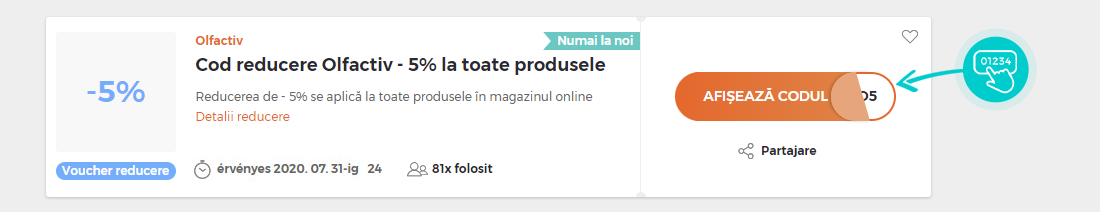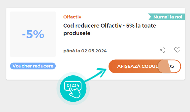 Selectați cod reducere concret de pe pagina noastră, pe care doriți să-l aplicați în magazinul online Olfactiv.ro. Faceți click pe butonul portocaliu „Afișează codul”.