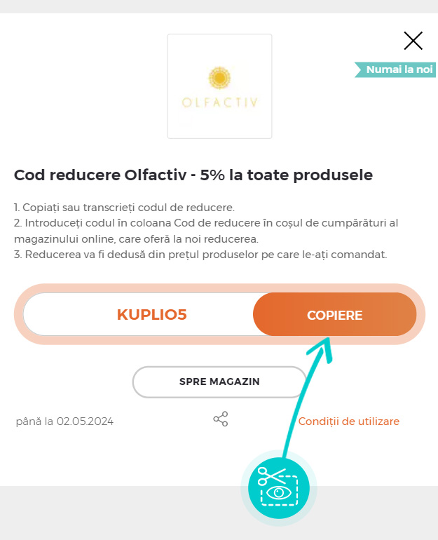 Dacă nu vreți să ratați nici o ofertă, urmăriți portalul Kuplio.ro, unde sunt oferte actualizate zilnic. Puteți obține un cod reducere Olfactiv valabil direct pe site-ul magazinului sau de pe rețelele de socializare ale magazinului sau prin abonarea la newsletter.
