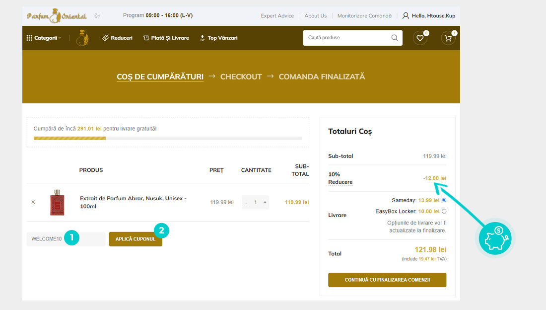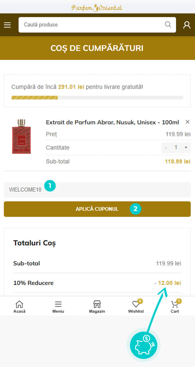 Alegeți produsul care vă interesează în magazinul online Parfumoriental.ro apăsați butonul „Adaugă în coș” și produsul se va introduce în coșul de cumpărături. În coșul de cumpărături sub produsul ales de dumneavoastră se află o rubrică „Adaugă un cod reducere“. Aici veți introduce cod reducere copiat sau îl transcrieți manual și confirmați prin butonul “Aplică“.