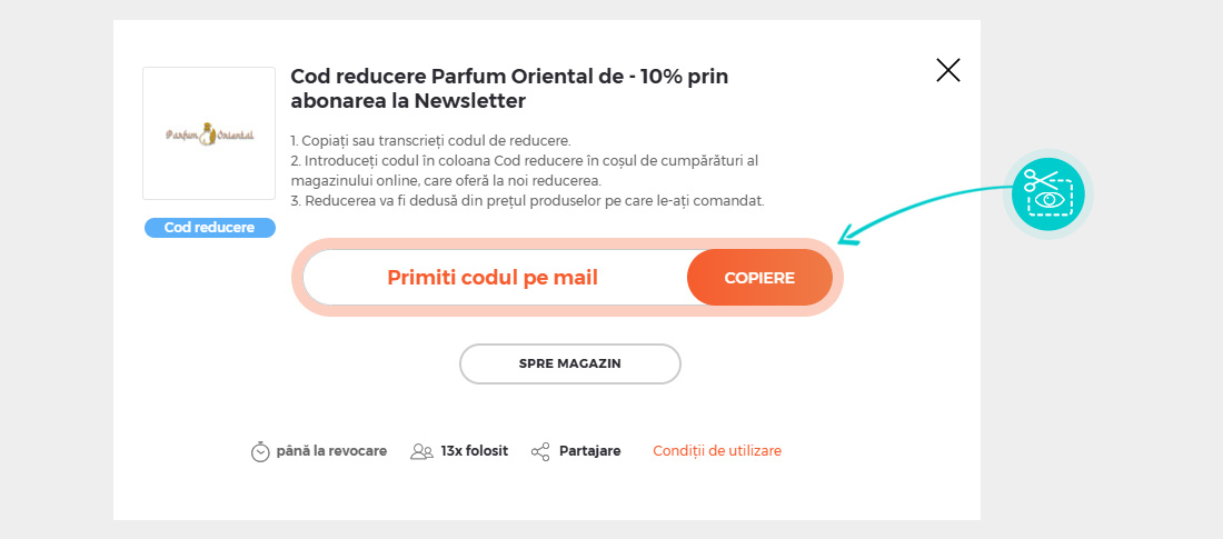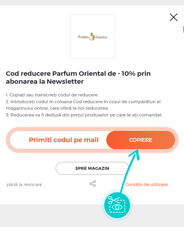 Selectați cod reducere concret de pe pagina noastră, pe care doriți să-l aplicați în magazinul online Parfumoriental.ro. Faceți click pe butonul portocaliu „Afișează codul”.
