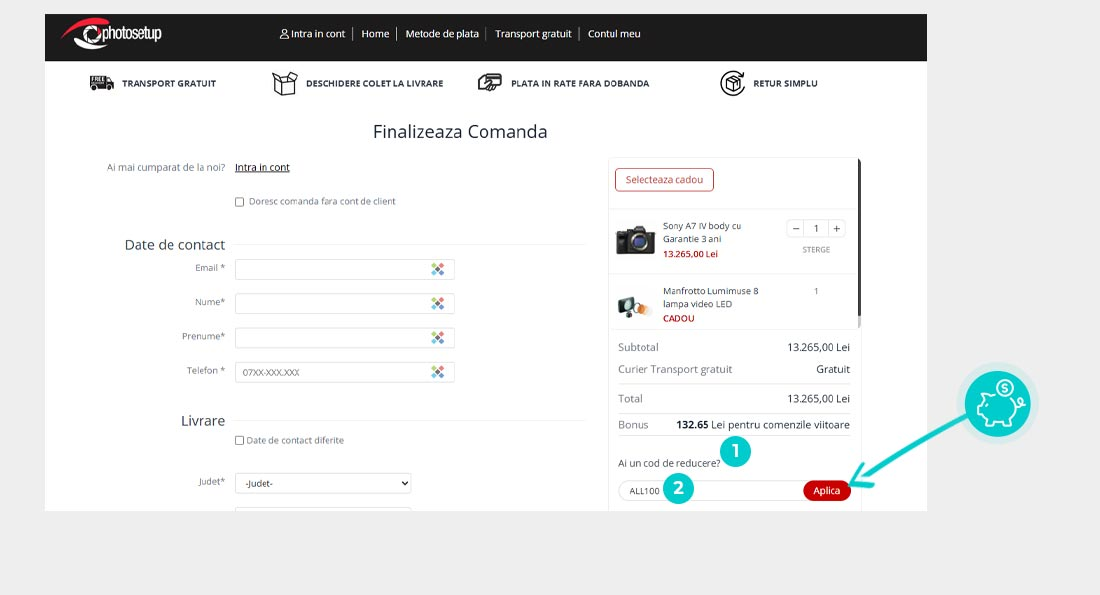 Alegeți produsul care vă interesează în magazinul online Photosetup apăsați butonul „Adaugă în coș” și produsul se va introduce în coșul de cumpărături. În coșul de cumpărături sub produsul ales de dumneavoastră se află o rubrică „Introdu mai jos Codul!“. Aici veți introduce codul de reducere copiat sau îl transcrieți manual și confirmați prin butonul “Confirmă“.