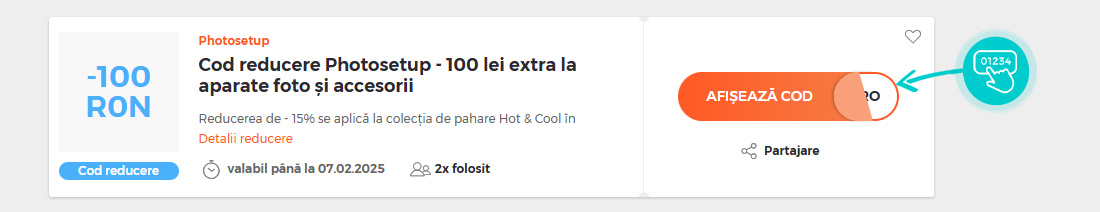 Selectați un cod reducere concret de pe pagina noastră, pe care doriți să-l aplicați în magazinul online Photosetup.ro. Faceți click pe butonul portocaliu „Afișează codul”.