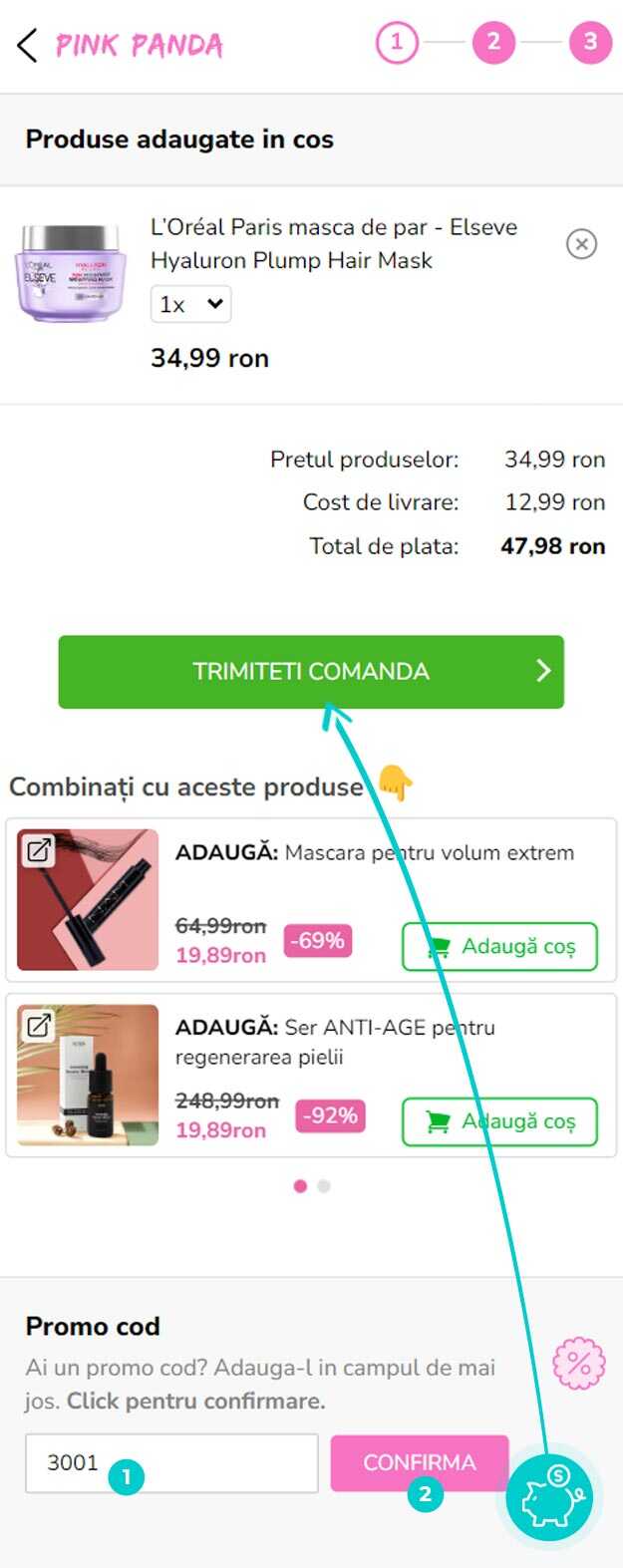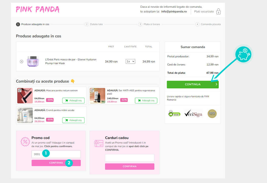 Alegeți produsul care vă interesează în magazinul online Pinkpanda.ro apăsați butonul „Adaugă articolul” și produsul se va introduce automat în coșul de cumpărături. În coșul de cumpărături sub produsul ales de dumneavoastră se află o rubrică „Cod voucher“. Aici veți introduce codul de reducere copiat sau îl transcrieți manual și confirmați prin butonul “Aplicare“.