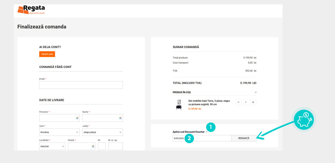 Alegeți produsul care vă interesează în magazinul online Regata.ro apăsați butonul „Adaugă la coș” și produsul se va introduce automat în coșul de cumpărături. În coșul de cumpărături sub produsul ales de dumneavoastră se află o rubrică „Am un cod promo“. Aici veți introduce cod reducere copiat sau îl transcrieți manual și confirmați prin butonul “Folosește“.
