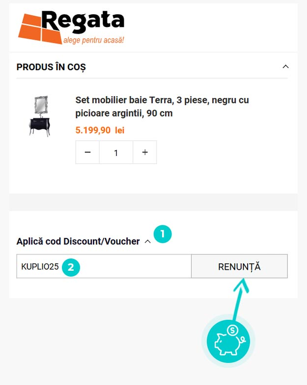Copiați sau transcrieți cod reducere și faceți click pe butonul portocaliu „Transfer în magazin“, ulterior veți fi redirecționat direct în magazinul online Regata.ro.