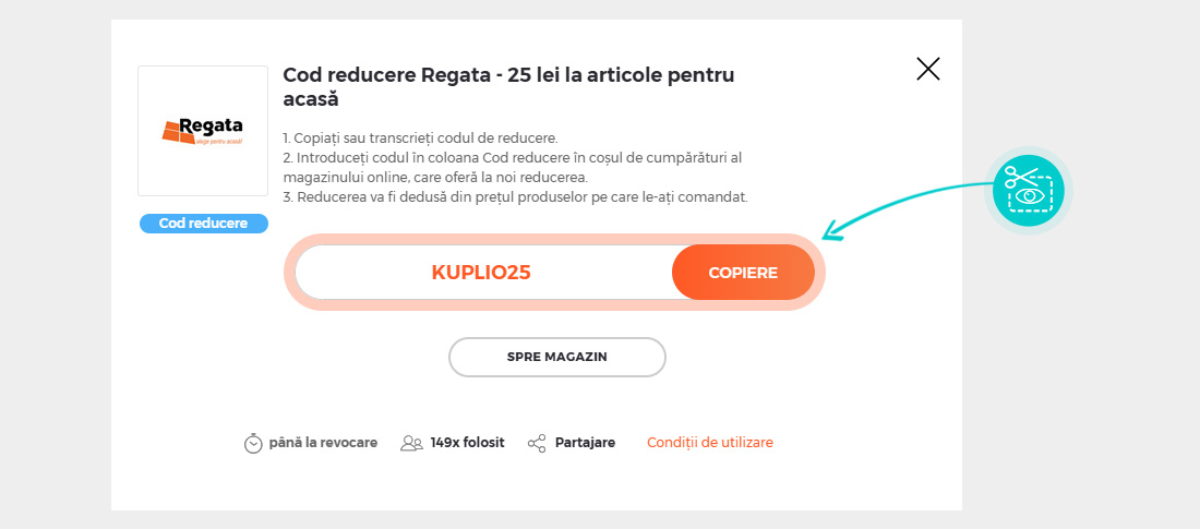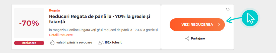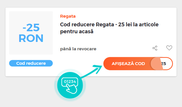 Selectați cod reducere concret de pe pagina noastră, pe care doriți să-l aplicați în magazinul online Regata.ro. Faceți click pe butonul portocaliu „Afișează codul”.