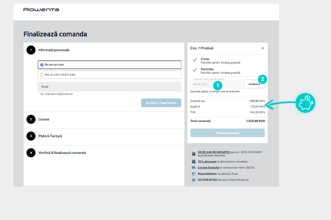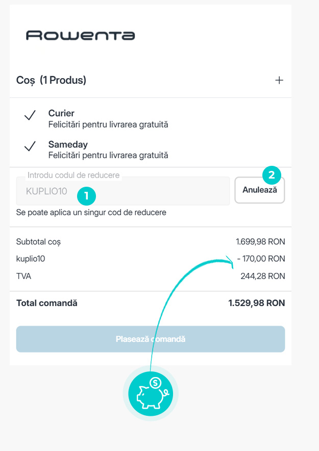 Alegeți produsul care vă interesează în magazinul online Shop.rowenta.ro.ro apăsați butonul „Adaugă în coș” și produsul se va introduce automat în coșul de cumpărături. În coșul de cumpărături sub produsul ales de dumneavoastră se află o rubrică „Ai un Voucher Cadou? Introdu codul aici“. Aici veți introduce cod reducere copiat sau îl transcrieți manual și confirmați prin butonul “Încarcă“.