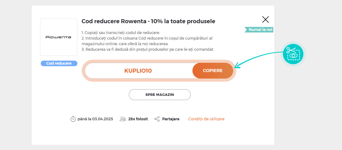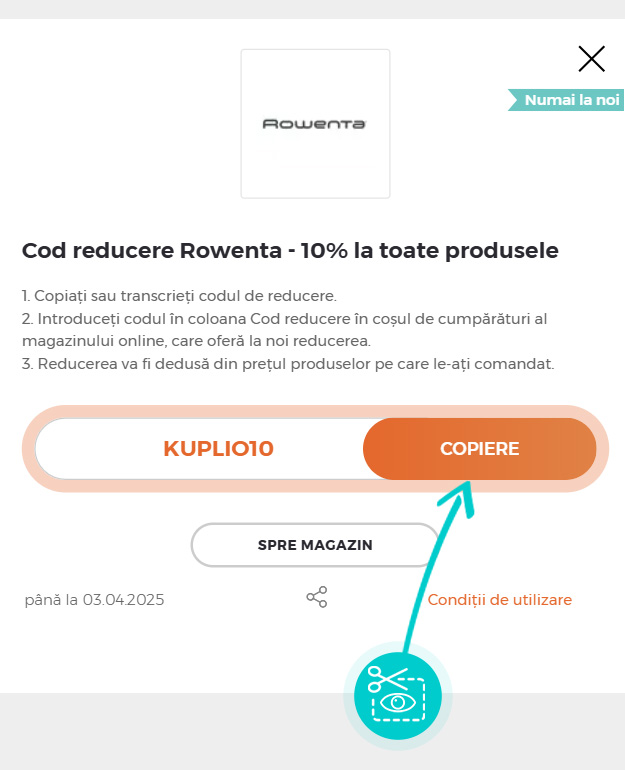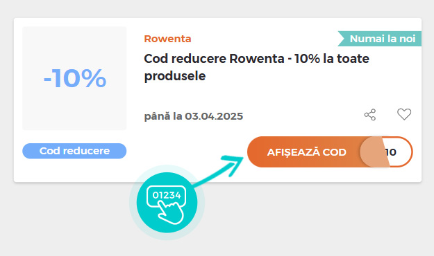 Dacă nu vreți să ratați nici o ofertă, urmăriți portalul KUPLIO.ro, unde sunt oferte actualizate zilnic. Puteți obține un cod reducere Rowenta valabil direct pe site-ul magazinului sau de pe rețelele de socializare ale magazinului sau prin abonarea la Newsletter.