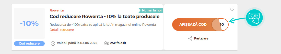 Selectați cod reducere concret de pe pagina noastră, pe care doriți să-l aplicați în magazinul online Shop.rowenta.ro. Faceți click pe butonul portocaliu „Afișează codul”.