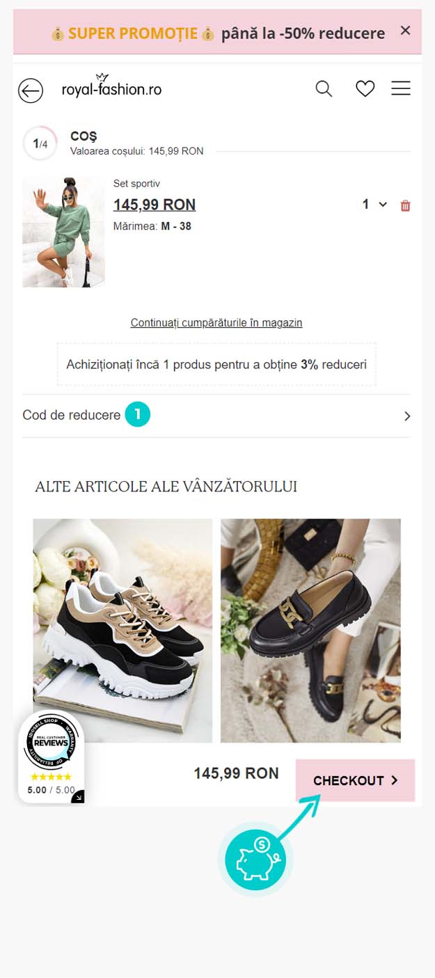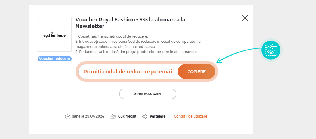 Copiați sau transcrieți codul de reducere și faceți click pe butonul portocaliu „Transfer în magazin“, ulterior veți fi redirecționat direct în magazinul online Royal Fashion.ro.